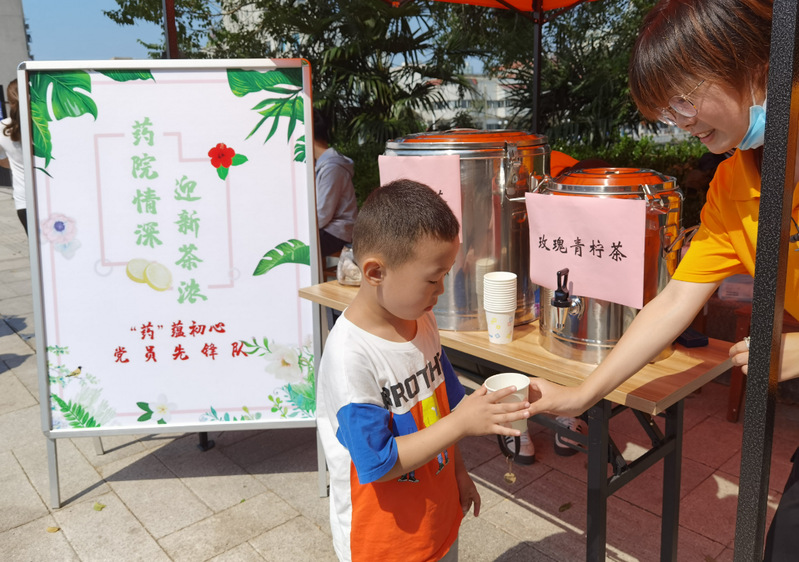在迎新现场,“确认过眼神,是‘药’一起奋斗的人”、“争做未来屠呦呦”等富有药学特色的迎新横幅手幅以及可爱的药学卡通人物将迎新点装扮的新颖别致。公司“药”蕴初心党员先锋队精心准备玫瑰青柠茶、山楂桂花茶,为萌新、志愿者和家长们送来清凉,消暑降温的同时减去一路奔波的劳累。公司还为每位新生精心准备了第一份礼物盲盒,里面收集了各类干花、草药,宣传普及药用植物的价值,“药”与你约,草木情缘。