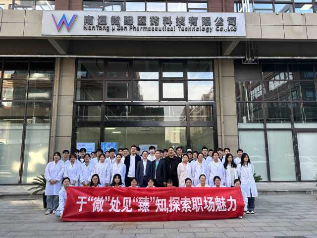 南通微臻医药科技有限公司总经理杭从荣对到访师生表示热烈欢迎,并通过PPT演示的方式,介绍了公司的发展历程、科技成果转化、核心技术产品、生产制备流程等内容。对公司有了初步了解后,他带领同学们先后参观了微针技术研发中心、质量控制中心、定制化微针生产GMP车间,并对微针技术运用原理、微米级机械加工组、给药动力机制等,对同学进行了答疑。交谈过程中他表示,希望通过此次活动,加强双方在产学研上的交流协作,构建人才“输送-接收”培养合作机制,助力提升药学人才培养的质量与水平。