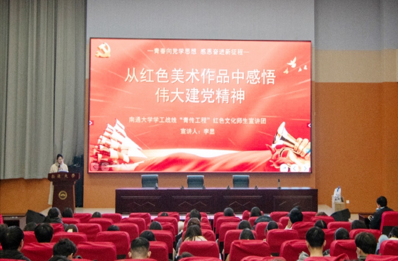 公司22级辅导员李显老师以《从红色美术作品中感悟伟大建党精神》为主题进行宣讲。她通过油画作品《启航——中共一大会议》把同学们拉回到百年前那个伟大的时刻,再现了中共一大南湖会议的历史瞬间,《我们一定会回来的》《狼牙山五壮士》等美术作品呈现出中国共产党走过的波澜壮阔的百年征程,彰显了伟大建党精神。