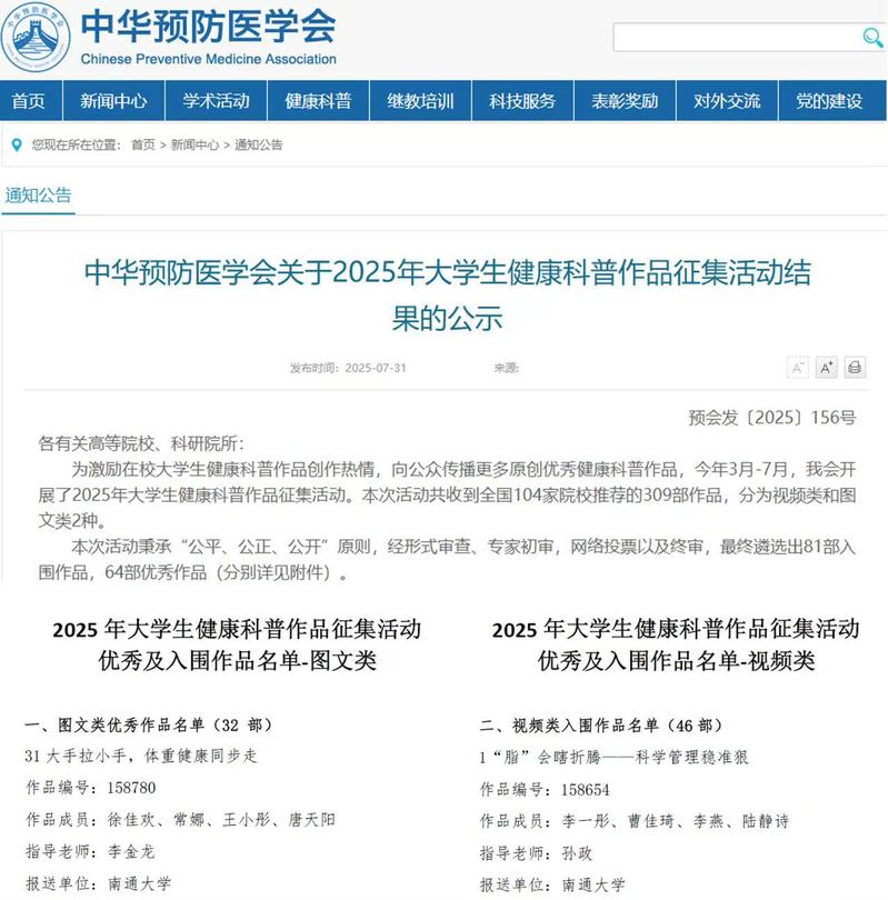 近日,中华预防医学会主办的2025年老员工健康科普作品征集活动结果揭晓。公司学子创作的2部科普作品从全国104所高校309部作品中脱颖而出,全部入围终评,其中图文《大手拉小手,体重健康同步走》作者:徐佳欢、王小彤、常娜、唐天阳,指导老师:李金龙)获评"优秀作品",视频《"脂"会瞎折腾—科学管理稳准狠》(作者:李一彤、曹佳琦、李燕、陆静诗,指导老师:孙政)获评"入围作品"。这一成绩既检验了公司人才培养成效,更彰显服务"健康中国"的社会担当。